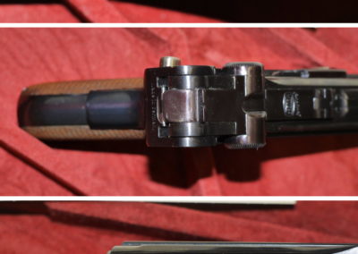 The pistol was usually very well made, and in its day it was one of the most reliable self-loading weapons. The main disadvantage was the relatively high production cost, unsuitable for a service weapon. The pistol was produced in many variants. Examples, original leaf return spring, model short frame, no palm safety, direction of operation of manual safety same as P.08, return spring wound). P.08 originally without the possibility of attaching a stock, during production (after the LP.08 was introduced to facilitate production) the possibility of attaching a stock was retained, barrel length 100mm, calibre 9 mm Luger. LP.08 – barrel length 203 mm, extension stock, adjustable tangential eight-position sight with adjustment of shooting distance (theoretical) up to 800m, first model with possibility of correction of sight and sights by screws, second model simplified without possibility of correction. From 1938 onwards, it was slowly replaced by the new German Walther P 38 pistol, which was much simpler and cheaper to produce.