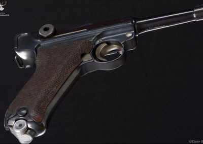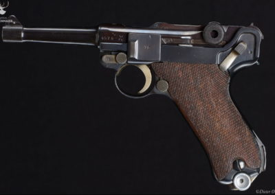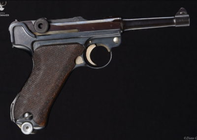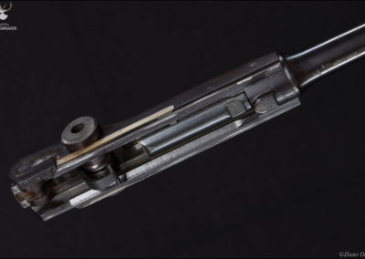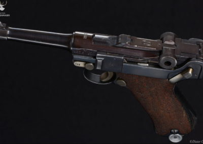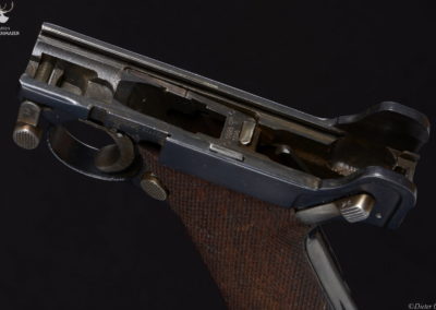 Self-loading pistol with locked breech. The breech is unlocked after a short recoil of the barrel & bolt assembly, when the breech knobs are deflected from the locked state after striking the stock, which is an integral part of the gun frame. The pistol was developed by George Luger from one of the first commercially successful self-loading pistols, the Borchardt C-93 pistol invented by Hugo Borchardt, which was inspired by the Maxim machine gun system. The Luger pistol was patented by Georg Luger in 1898. In 1900, it was produced in Germany by Ludwig Loewe’s Deutsche Waffen- und Munitionsfabriken (DWM).
